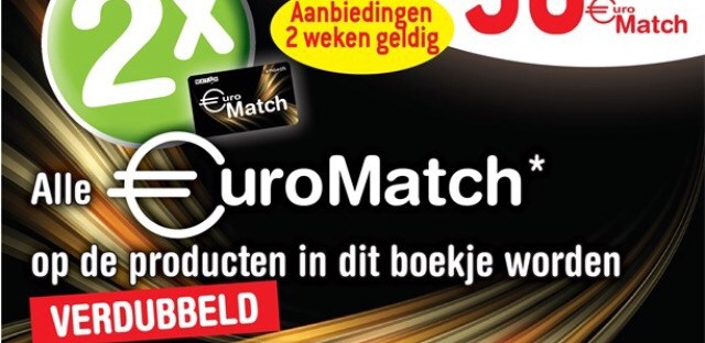 2x 3,46 – 3,46 op je €-match kaart= €3,46 – €1 (bon) – €1 (verdubbelde bon) = €1,46