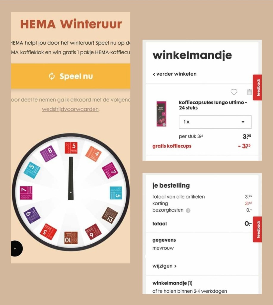👉 Draai aan het rad 👉 Kopieer de code 👉 Kies een smaak 👉 Ga naar je winkelmandje en voer de code in 👉 Kies een filiaal om af te halen (kosten €o) 👉 Haal je gratis koffie op na 2-4 werkdagen